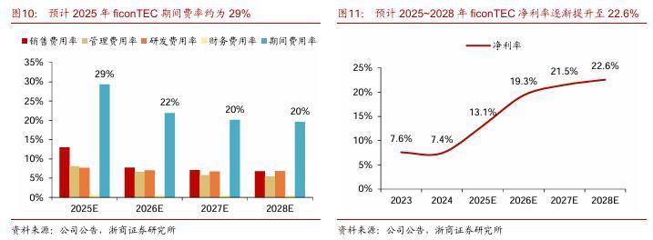 值得一提的是,在罗博特科的公司发展史里,入股并最终收购ficonTEC是具有里程碑意义的事件。通过收购全球高精耦合设备龙头ficonTEC,罗博特科掌握了用于组装与测试硅光器件的专有且难以复制的核心技术及专有技术,并覆盖了整个高精密制造过程并满足数通、电信及其他市场的特定应用需求。据悉,罗博特科收购ficonTEC 事项于今年5月完成,此后ficonTEC 已正式并表。另据浙商证券披露的深度报告,预计ficonTEC在2025年期间费率约为29%,并逐步降至2028年的20%;2025年净利率预计为13.1%,或逐步升至2028年的22.6%。