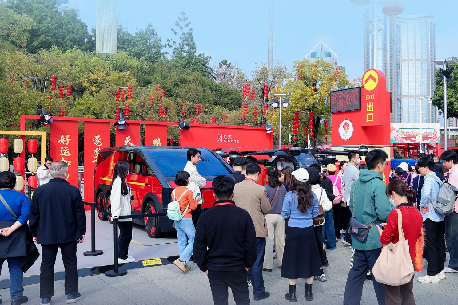 2月13日,广州天河迎春花市开市首日,天河体育中心现场人头攒动。与往年不同的是,今年的花市不仅有姹紫嫣红的年花、年桔,更迎来了特殊的“科技年货”——小鹏汇天陆地航母飞行汽车。